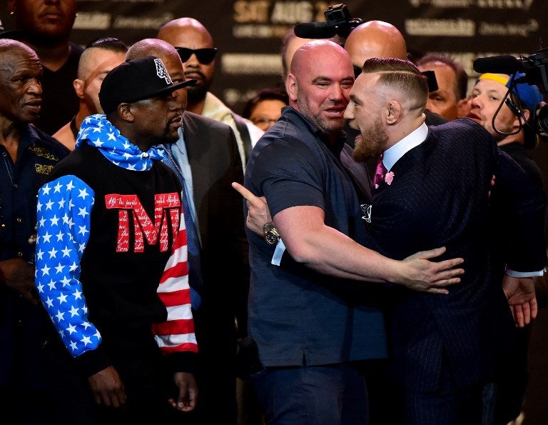 La pelea verbal entre el invicto monarca del boxeo Floyd Mayweather y el campeón ligero de la UFC Conor McGregor comenzó en Los Ángeles con la promesa del irlandés de que noqueará en el cuarto asalto en tanto que su rival estadounidense garantizó que le pateará el trasero el 26 de agosto.