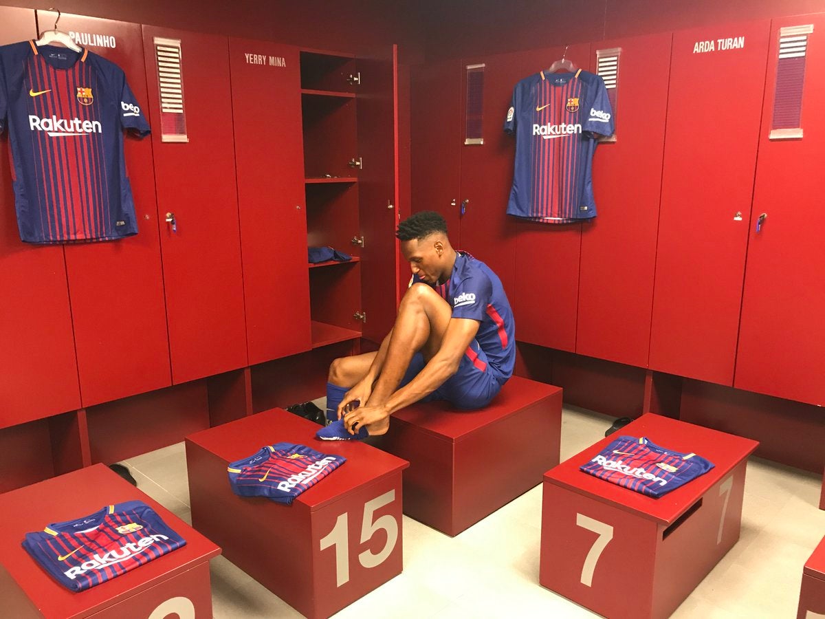 El central Yerry Mina este sábado fue presentado como nuevo jugador barcelonista y ejerció como azulgrana después de someterse el viernes a la habitual sesión fotográfica ante el escudo de las oficinas de la entidad y pasar la revisión médica.