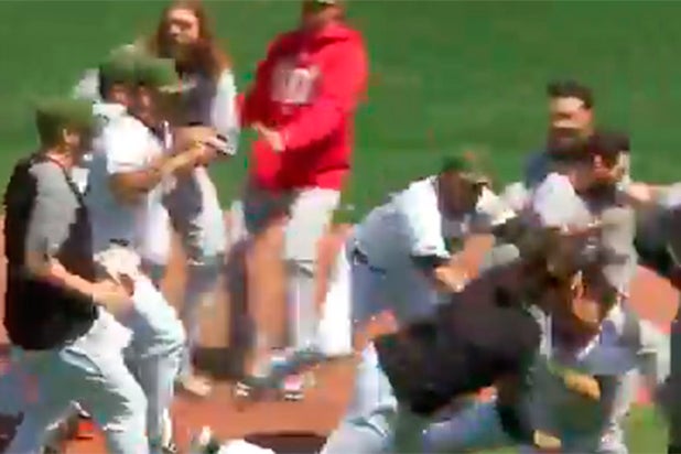Nadie se interpuso en la trayectoria de Harper, que al llegar al montículo se quitó el casco y lo lanzó, sin que éste le pegara al lanzador de los Gigantes. Strickland, quien mide 1,93 metros (seis pies y cuatro pulgadas), impactó a Harper en el rostro con un derechazo. Ambos se separaron un momento antes de liarse otra vez a puñetazos. Fue entonces cuando Harper asestó un golpe de derecha a la nariz del lanzador, mientras se vaciaban las bancas y los bullpens.