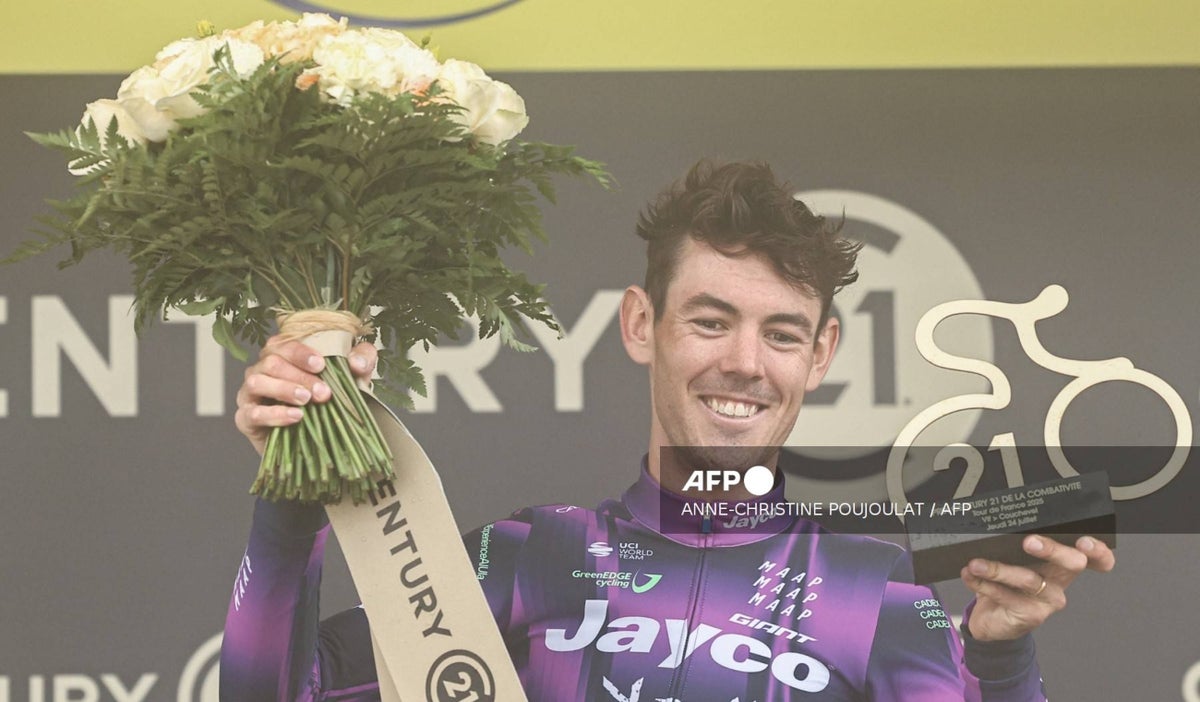 El ciclista australiano del equipo Team Jayco AlUla, Ben O'Connor, celebra en el podio con el premio a la combatividad tras ganar la 18.ª etapa de la 112.ª edición del Tour de Francia, una jornada de 171,5 km entre Vif y Courchevel Col de la Loze, en los Alpes, al sureste de Francia. Crédito: AFP