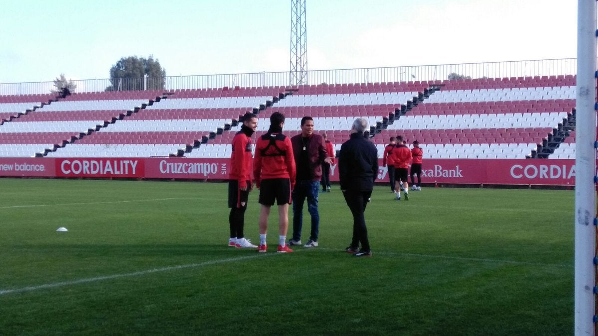 Bacca accedió al terreno de juego del campo principal de la ciudad deportiva, donde trabajó la primera plantilla sevillista, y departió unos minutos con jugadores con los que coincidió en las dos temporadas que estuvo en el conjunto de Nervión, entre ellos el internacional español Víctor Machín 'Vitolo'.