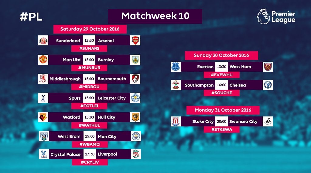 El Mánchester City (1º), el Arsenal (2º), y el Liverpool (3º), igualados a puntos (20), pugnarán por el liderato en solitario en la décima fecha del campeonato inglés, fuera de casa ante rivales asequibles; el West Bromwich (13º), el Sunderland (20º) y el Crystal Palace (11º) respectivamente.