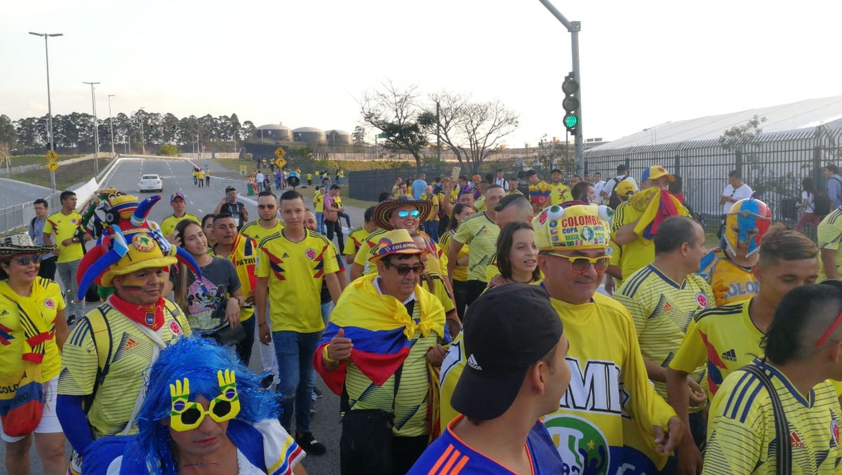 Los hinchas colombianos tiñeron de amarillo el Arena Corinthians para el partido del conjunto ‘cafetero’ ante Chile en el marco de los cuartos de final de la Copa América. Tal como ha sido la costumbre, los aficionados de la ‘tricolor’ hicieron la fiesta en la previa de un encuentro entre dos de las mejores escuadras del certamen.