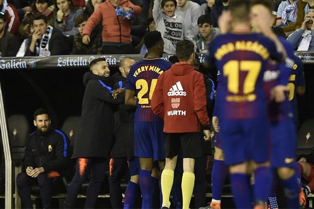 Tras la expulsión de Sergi Roberto por una falta sobre Iago Aspas, el Celta trató de aprovechar su superioridad numérica y en el 82 Aspas aparecía para rematar un pase de Emre Mor al fondo de las mallas azulgranas ayudándose con el brazo.