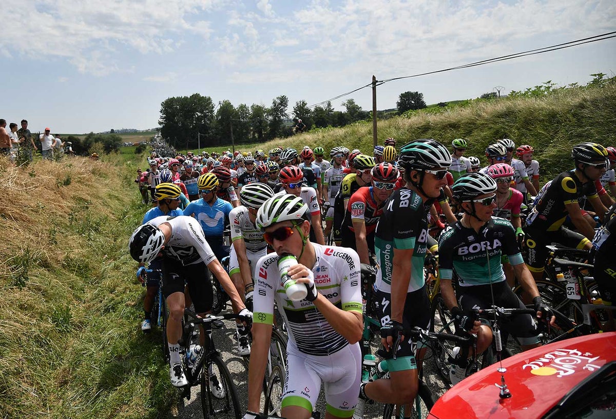 Algunos manifestantes han arrojado al paso del pelotón algún tipo de líquido irritante que ha obligado a un buen número de ciclistas a lavarse la cara.