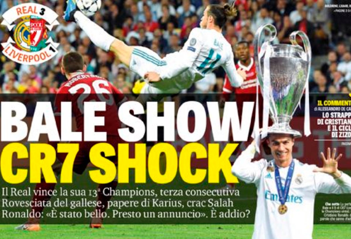 "Bale show, CR7 shock", se lee en la portada de "La Gazzetta dello Sport", que subraya además el gran gesto técnico de Bale, la lesión en un hombro sufrida por el egipcio del Liverpool Mohamed Salah y los graves errores del meta de los ingleses, el alemán Loris Karius.