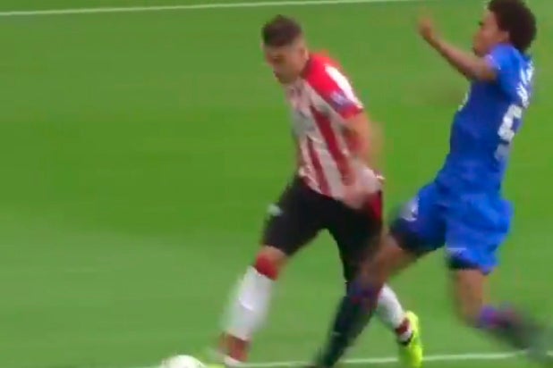 Stengs, tratando de entrar al área rival sorteando jugadores para armar juego, chocó con un rival y cayó al césped de la peor manera tras la disputa por el balón.