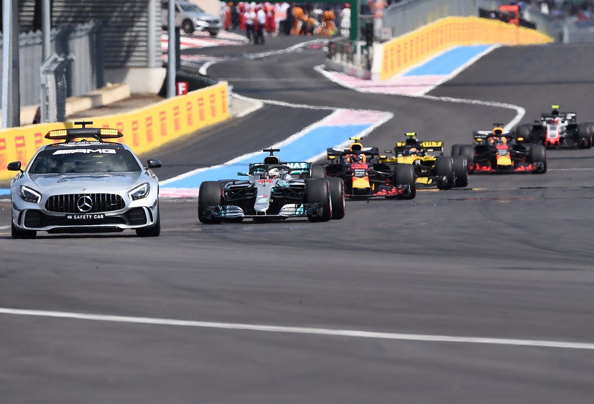 Verstappen y Sainz aprovecharon la circunstancia para colocarse segundo y tercero mientras el coche de seguridad tuvo que intervenir para que se retiraran de la pista los restos esparcidos tanto de los coches de Vettel y Bottas como los de los franceses Pierre Gasly (Toro Rosso) y Esteban Ocon (Force India), que se quedaron fuera de la carrera de casa al chocar en el comienzo.