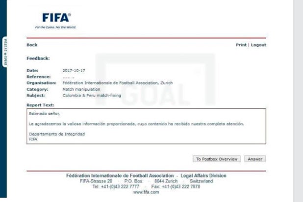 Ahora, dicha demanda ha sido aceptada por la FIFA, a manera de trámite, lo que no implica que se vayan a tomar acciones de rigor. “Me enviaron el papel de España. Es totalmente confiable”, dijo Sosa luego de publicar el documento. “Le agradecemos la valiosa información proporcionada, cuyo contenido ha recibido nuestra completa atención”, dice el texto del documento del mencionadoo Comité. “Ahora el caso va al Tribunal de Disciplina, que debe evaluar si hay méritos para iniciar la investigación”, dijo Sosa.