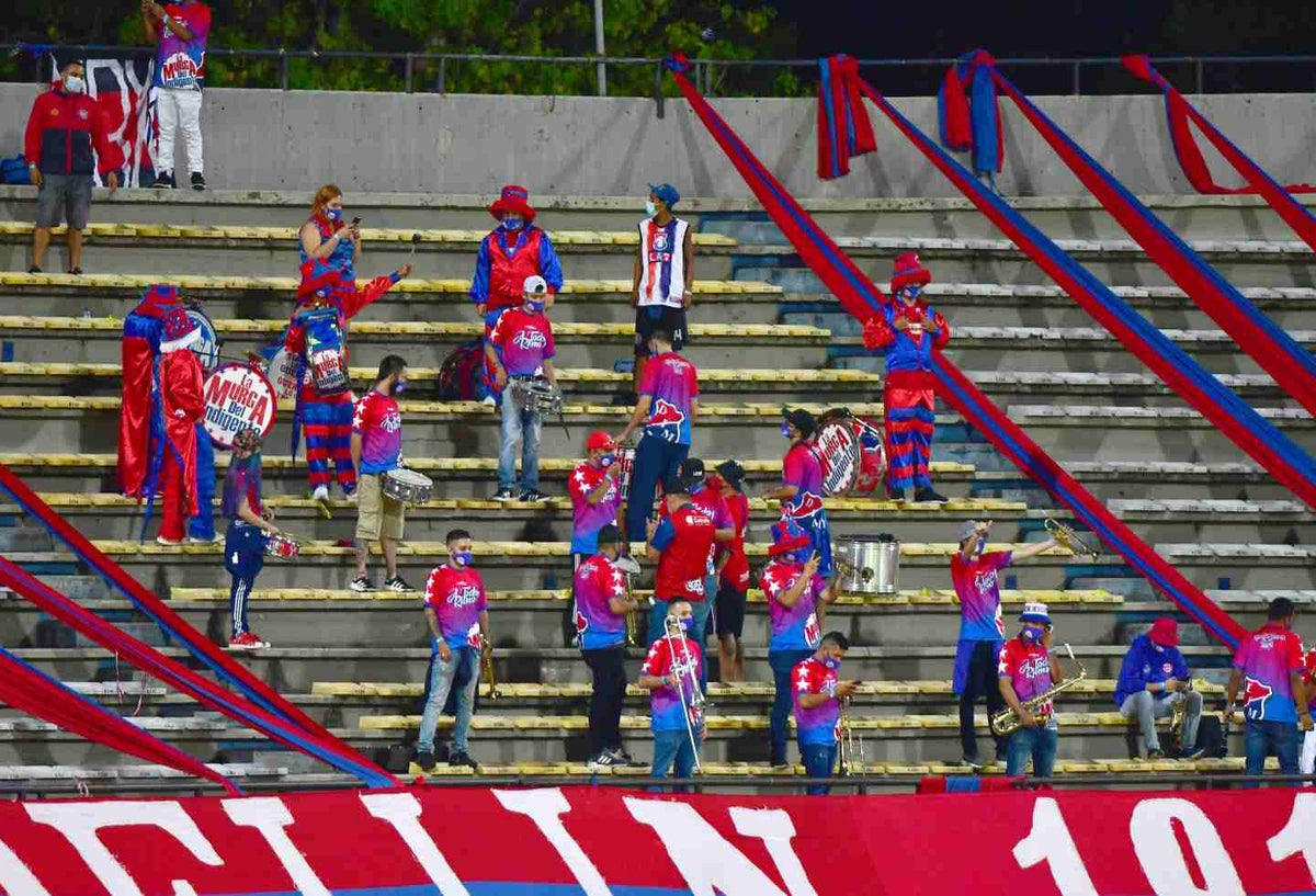 A pesar de ser un número reducido, los hinchas se hicieron sentir con sus instrumentos y con sus prendas rojas y azules características al equipo antioqueño.