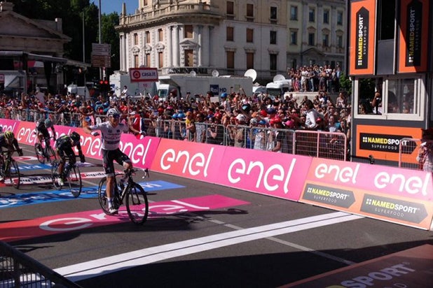 Jungels, de 24 años de edad, fue el más rápido entre el grupo de favoritos que se disputaron al esprint la victoria en Bergamo, donde levantó los brazos por delante del colombiano Nairo Quintana (Movistar), quien limó 6 segundos a Dumoulin en la general, y del francés Thibaut Pinot (Francaise), todos con un tiempo de 4h.16.31