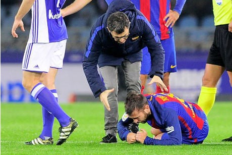 Otro defensa culé que salió tocado del partido de Anoeta, Gerard Piqué, sufre molestias en su tobillo izquierdo, una articulación que ya le había dado problemas esta temporada. "En la primera parte me dolió un poco, pero esperemos que pueda estar para el sábado", comentó el central a la cadena español Movistar +.