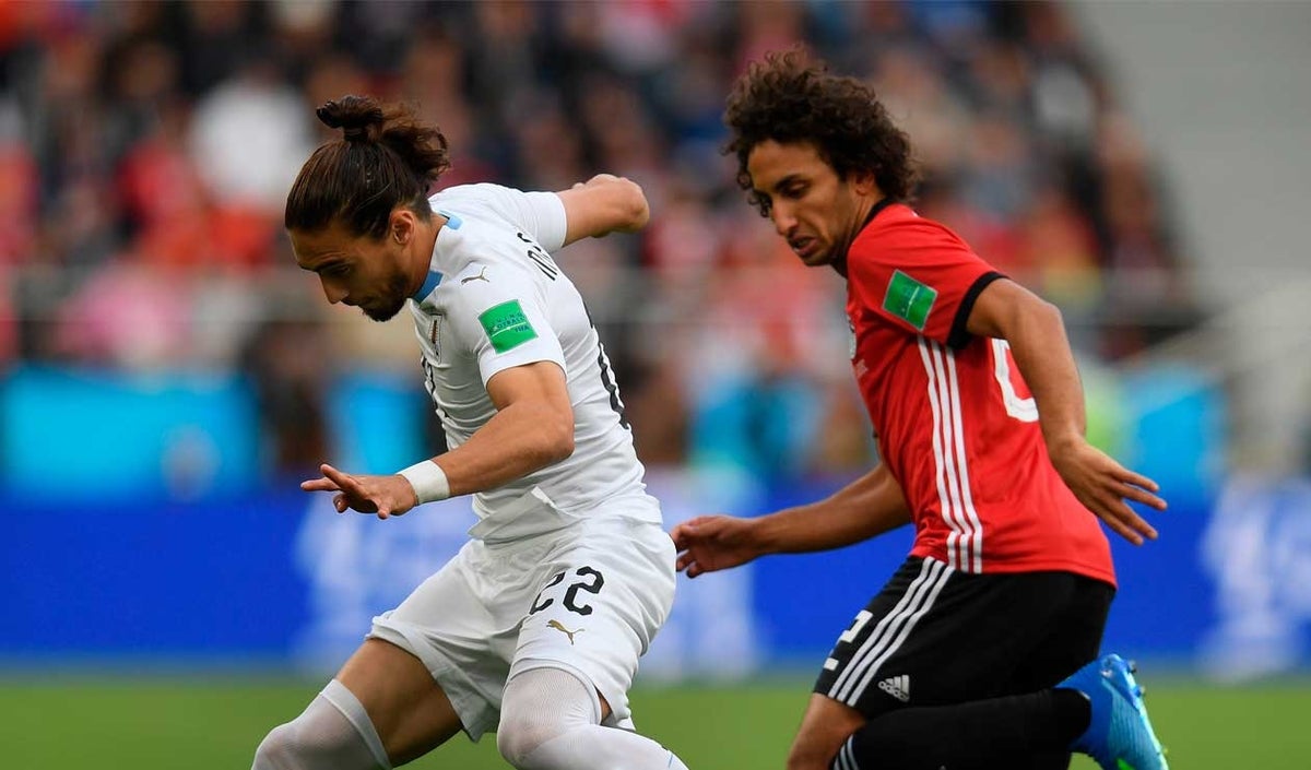 Martín Cáceres, de Uruguay, defendiendo el balón ante un jugador de Egipto Crédito: AFP