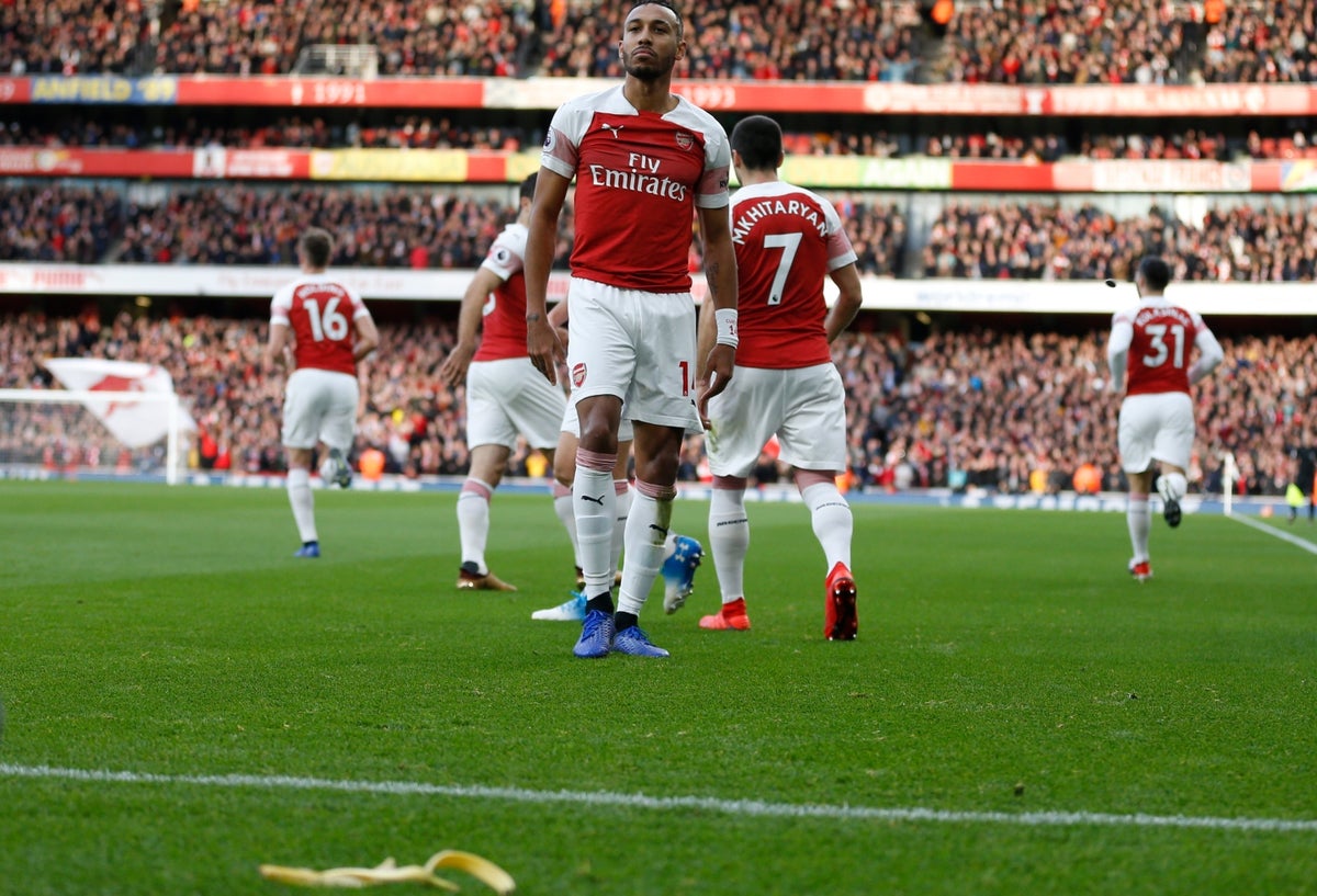 El incidente se produjo durante el derbi londinense entre los 'Gunners' y los 'Spurs', que ganó el Arsenal 4-2 en su Emirates Stadium. Tras inaugurar el marcador con un penalti, Aubameyang celebró su gol delante de los aficionados rivales, antes de que cayera la piel de plátano delante de él.