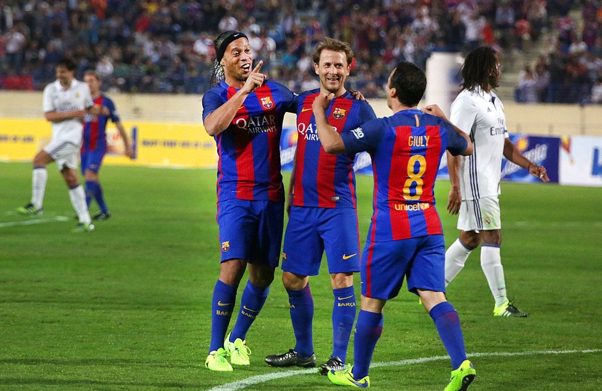 Los veteranos del Barcelona, guiados por el brasileño Ronaldinho, que participó en los tres goles azulgranas, se impusieron por 3-2 a los del Real Madrid en el "Clásico de leyendas" disputado en el estadio Camille Chamoun de la capital libanesa.