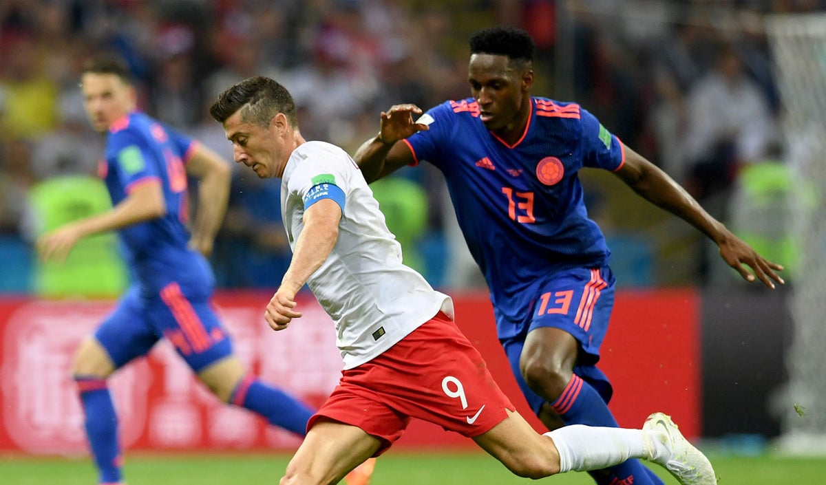 Lewandowski ante Yerry Mina en el partido entre Polonia y Colombia en el Mundial de Rusia 2018 Crédito: Colprensa