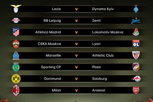 Lazio (ITA) - Dinamo Kiev (UCR) RB Leipzig (ALE) - Zenit SP (RUS) Atlético de Madrid - Lokomotiv Moscú (RUS) CSKA Moscú (RUS) - O. Lyon (FRA) O. Marsella (FRA) - Athletic Club Bilbao Sporting Portugal (POR) - Viktoria Plzen (RCE) Borussia Dortmund (ALE) - Salzburgo (AUT) Milan (ITA) - Arsenal (ING)