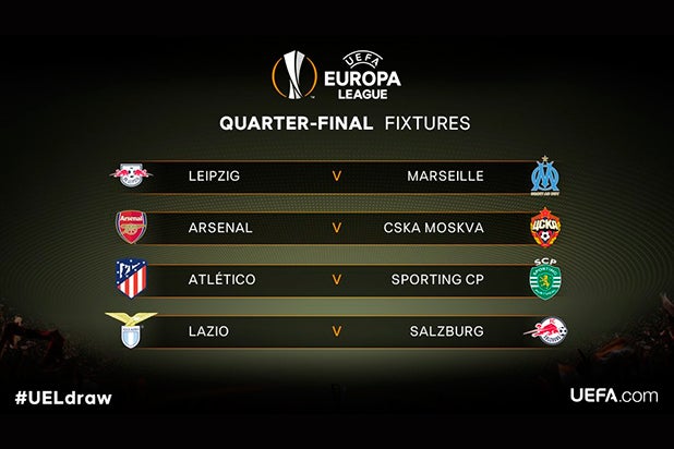 Atlético de Madrid-Sporting Lisboa y Arsenal-CSKA Moscú son los dos enfrentamientos más destacados de los cuartos de final de la Liga Europa, según el sorteo celebrado en la sede de la UEFA en Nyon (Suiza).