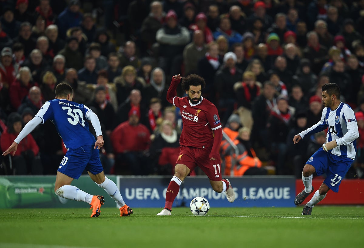 Mohamed Salah (Liverpool), marcado por Diogo Dalot y Ragnar Klavan (Porto) en Anfield, en duelo de Champions disputado el 6 de marzo de 2018