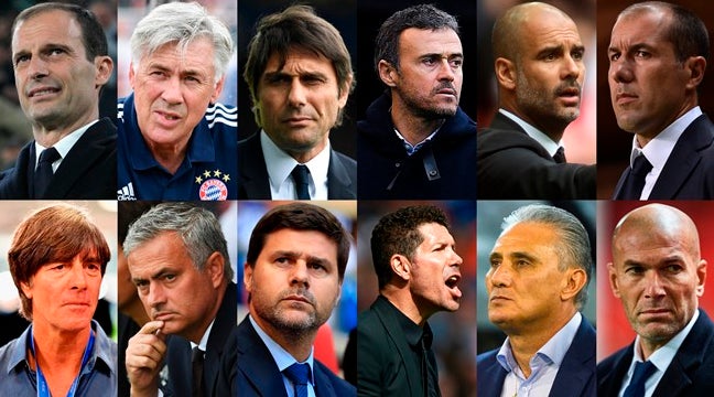 La relación la completan Massimiliano Allegri (Juventus), Carlo Ancelotti (Bayern Múnich), Antonio Conte (Chelsea), Leonardo Jardim (Mónaco), Joachim Low (Selección Alemania), Mauricio Pochettino (Tottenham Hotspur) y Tite (Selección Brasil).