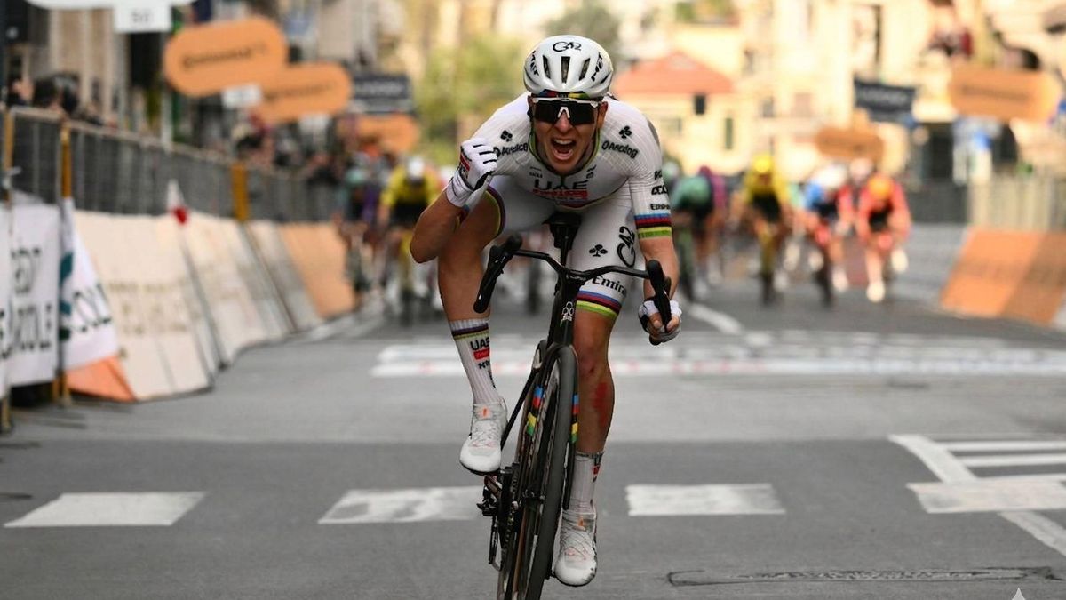 Pogacar volvió a atacar y esta vez Van der Poel no pudo aguantar y cedió a nueve kilómetros de meta. Los dos hombres más fuertes del día realizaron el descenso juntos y lograron mantener una ventaja de unos segundos en los dos últimos kilómetros llanos que llevaban a la llegada en la Vía Roma, donde Pogacar batió a Pidcock en un emocionante esprint.