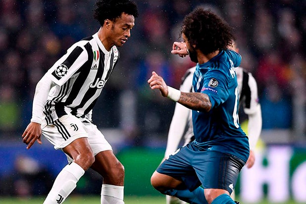 Cuadrado y Marcelo disputando un balón en el Allianz Stadium / Foto oficial de Juventus.