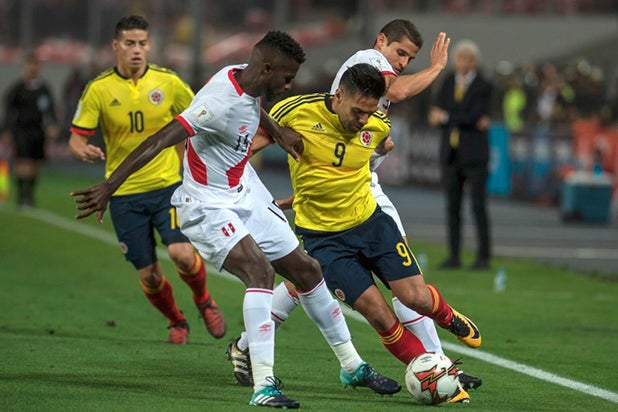 Falcao, en acción ante Christian Ramos, el 10 de octubre de 2017 en Lima (Perú) / AFP