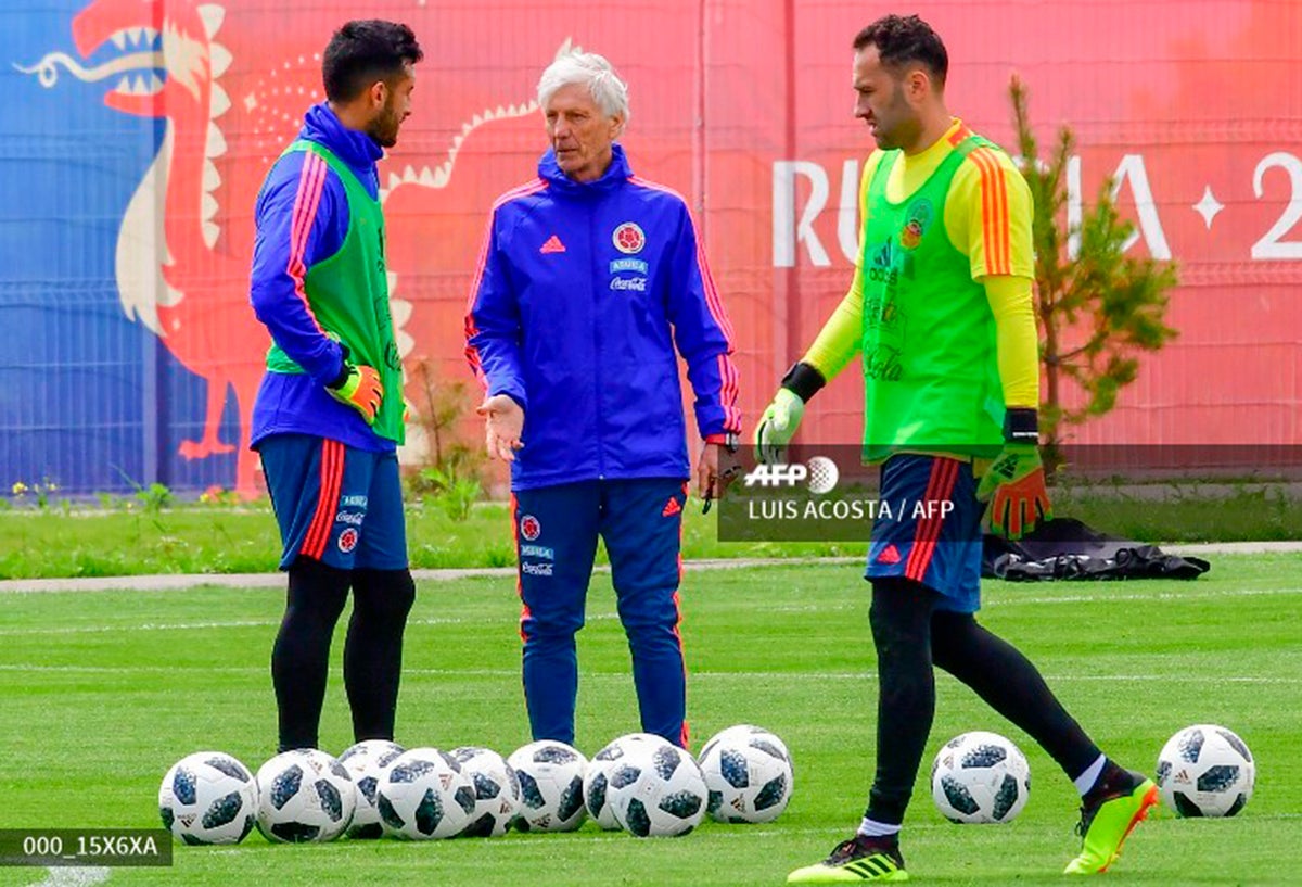 Camilo Vargas, José Pékerman y David Ospina en la sesión de entrenamiento en Kazán