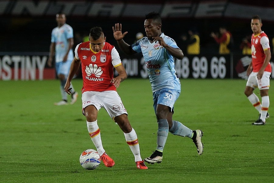 En el primer tiempo el que salió con la iniciativa fue Santa Fe, que con Pajoy y Plata encontró en las bandas salida para crear peligro sobre el arco rival. Sin embargo, en una salida de contragolpe, Jaguares al minuto 3 tuvo opción tras un error en defensa de Urrego.