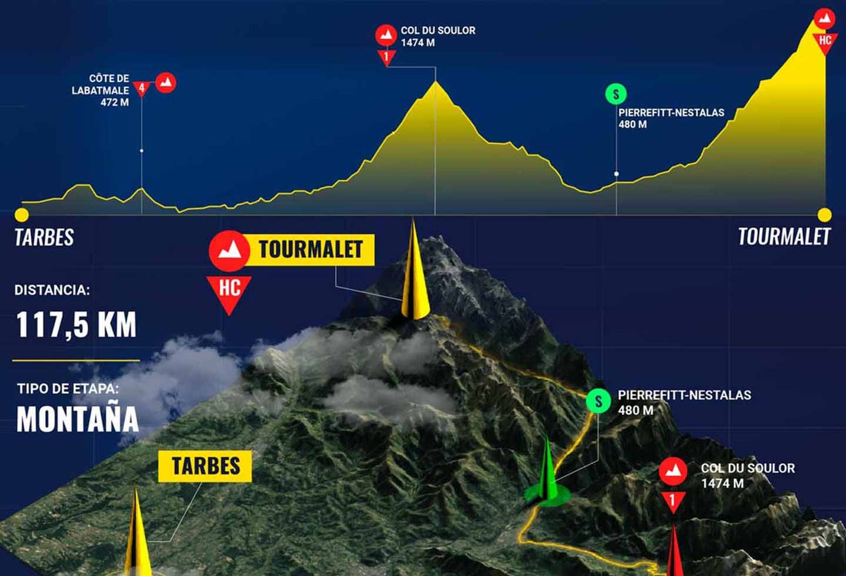 En el Tourmalet, los aspirantes al título deberán enfrentar el primer puerto fuera de categoría que tiene la carrera gala. Previamente, habrá que sobrepasar la cima del Col du Soulor en el kilómetro 60. Allí se comenzará a seleccionar el grupo principal de la jornada con una trepada prolongada.