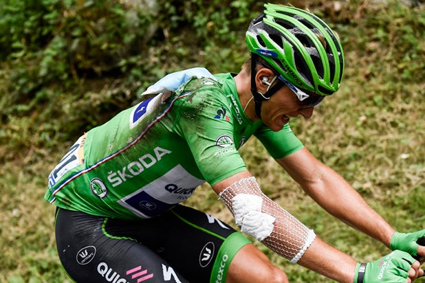 Kittel, que en total suma 14 triunfos en la ronda gala, estaba a punto de ceder el liderazgo de la clasificación de la regularidad por la presión del australiano Michael Matthews, ganador de dos etapas, incluida la de ayer, martes, y más cómodo con el terreno montañoso. El ciclista germano se vio inmerso en una caída en la que también estaba el francés Warren Barguil, líder de la clasificación de la montaña, que sigue en carrera.