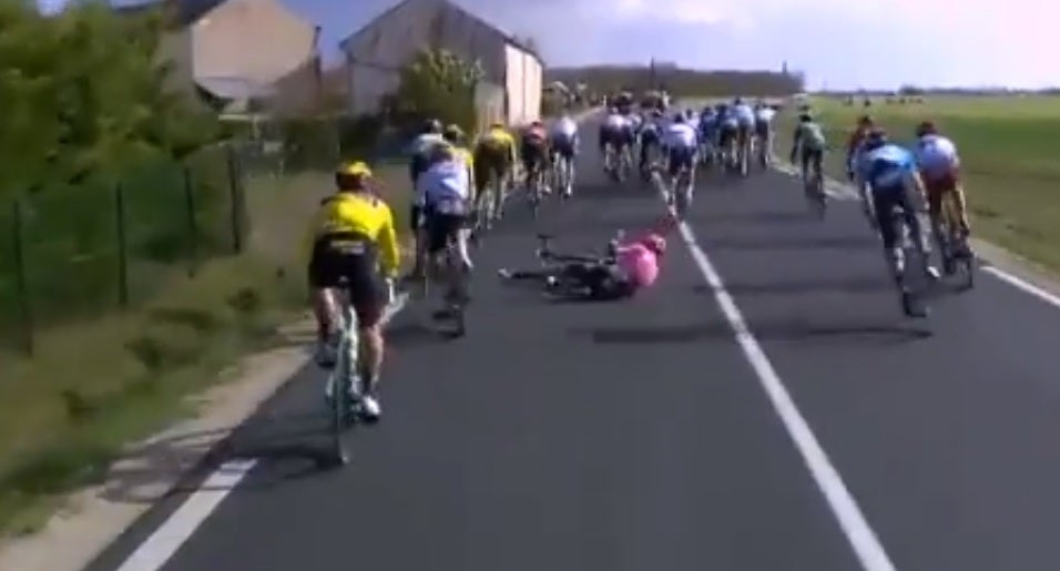 Su rueda delantera tocó la de otro corredor en el pelotón que avanzaba a buen ritmo en un terreno plano y al instante cayó al suelo. El colombiano pudo poner sus brazos para evitar un impacto más fuerte, pero su bicicleta dio media vuelta en el aire y derrapó por el asfalto, sufriendo evidentes afectaciones.