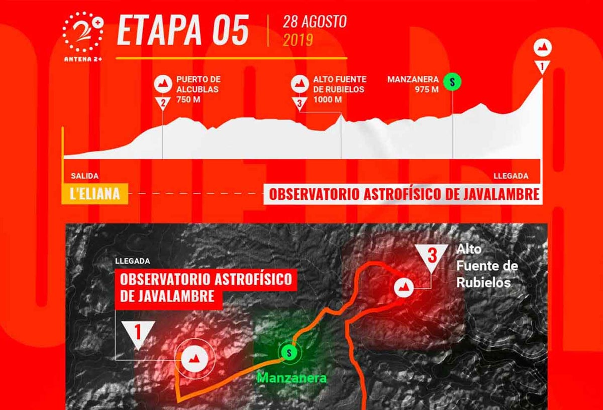 Tras el embalaje, comenzará la máxima exigencia para los favoritos a la clasificación general de la Vuela a España, teniendo en cuenta que desde el km 158.8 iniciarán la difícil escalada al Observatorio Astrofísico de Javalambre, que será de primera categoría, y terminará a 1950 metros sobre el nivel del mar.