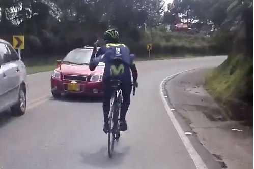 "Cuál es la manía de algunos conductores que ven a un ciclista por su carril y se lanzan a adelantar en contra vía poniéndonos en riesgo", comentó Anacona en su cuenta en Twitter, tras publicar el video.