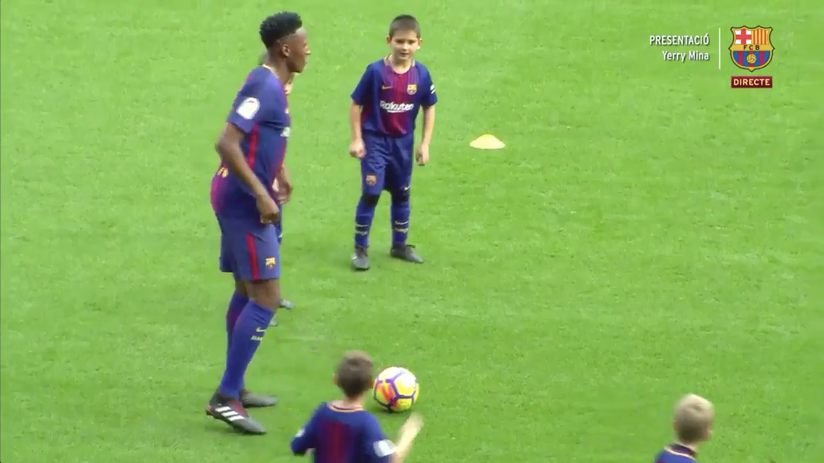Yerry Mina recibe la bienvenida de los niños de la escuela de fútbol del Barcelona