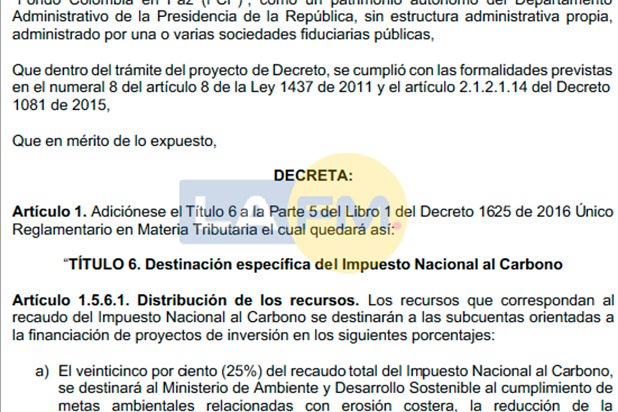 Dentro de los argumentos expuestos en el decreto se establece cómo, el 75 por ciento del impuesto al carbono, se trasladará a la paz. "Que el artículo 223 de la Ley 1819 de 2016 estableció que el recaudo del impuesto nacional al carbono se destinaría al Fondo para la Sostenibilidad Ambiental y Desarrollo Rural Sostenible en Zonas Afectadas por el conflicto y los recursos se orientarían, entre otros, al manejo de la erosión costera, a la conservación de fuentes hídricas y a la protección de ecosistemas de acuerdo con los lineamientos que para tal fin establezca el Ministerio de Ambiente y Desarrollo Sostenible", agregó.