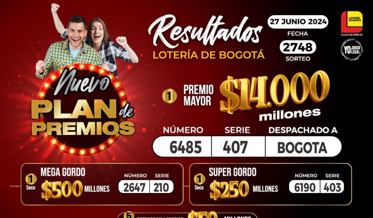 La Lotería de Bogotá ha confirmado su plan de premios para el jueves 27 de junio de 2024, destacando un premio mayor de 14.000 millones de pesos.