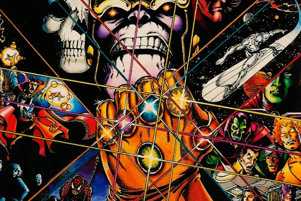 Es el guantelete del infinito en la mano de Thanos, en una posición y con una expresión muy similar a la que aparece en la icónica portada del cómic 'The Infinity Gauntlet'.