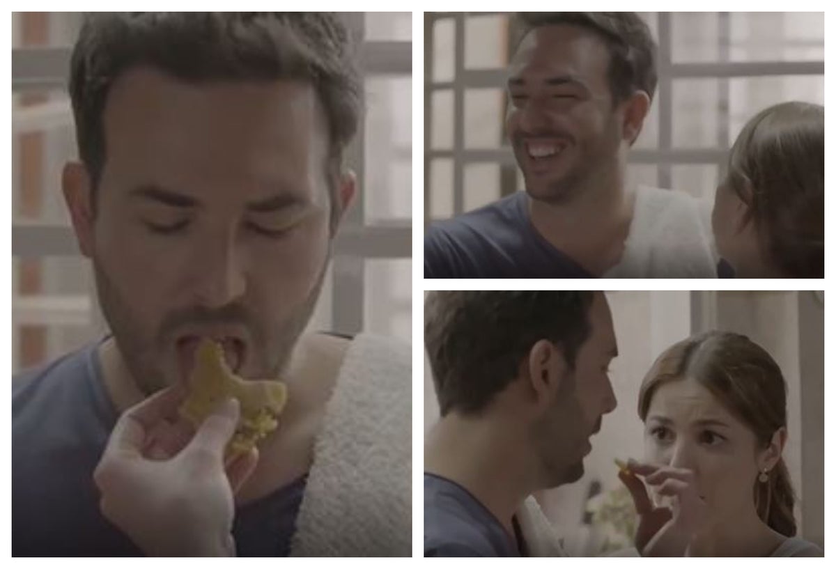 En esta escena, a ambos actores los invade la risa cada vez que llega la parte en que Sebastián Martínez dice que quiere bañarse tras probar el patacón.