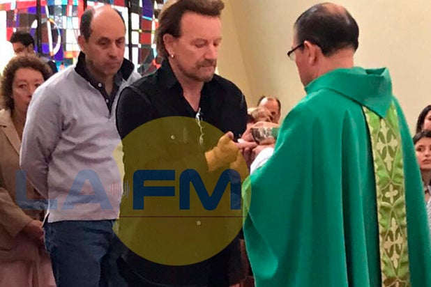 Tras la presentación, el cantante Paul David Hewson, mejor conocido en el mundo como Bono, estuvo este domingo 8 de octubre en una eucaristía en el Gimnasio Moderno. Esta fotografía da cuenta del momento en que el músico irlandés recibe la comunión.