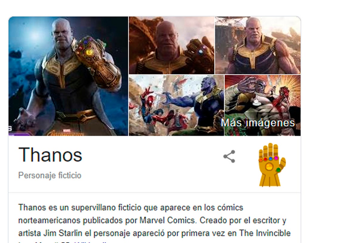 Al buscar en Google el nombre del titán, la plataforma de búsqueda arroja varios resultados, como lo hace usualmente sobre el personaje, pero al observar a un costado aparece el guante del infinito. Al oprimirlo, la mano chasquea los dedos y al instante la información sobre el villano comienza a desaparecer de la misma forma que los Avengers lo hicieron en ‘Infinity War’.
