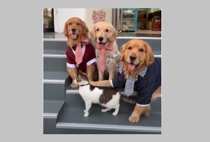 Se trata de una sesión de fotos que una familia decidió realizar a sus mascotas, tres perros de raza Golden, que muy elegantes posaron para lograr la imagen perfecta. Sin embargo, su odioso y parco compañero felino, que también estaba invitado, se rehusó a participar del momento.