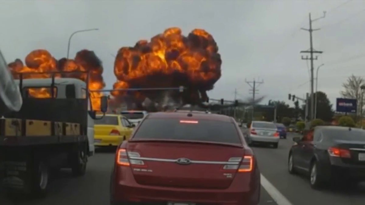 Un video capturado desde un vehículo muestra el momento en que una avioneta, que sobrevolaba una autopista en el estado de Washington, EE.UU. colisionó contra el asfalto.