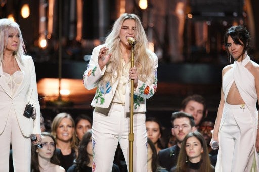 Vestida con un traje blanco, así como Cyndi Lauper, Camila Cabello y varias otras cantantes que la acompañaban, Kesha hizo una sentida interpretación que terminó en lágrimas, tanto de ella como de muchos presentes.
