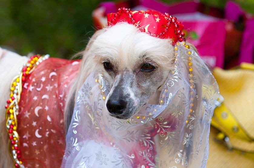 Princesa a lo Jasmín: Disney es una gran inspiración no solo para tu disfraz, sino también para el de tu mascota. Aunque no consigas una copia tal cual del vestuario de esta famosa princesa, puedes recurrir a usar velos o telas brillantes.