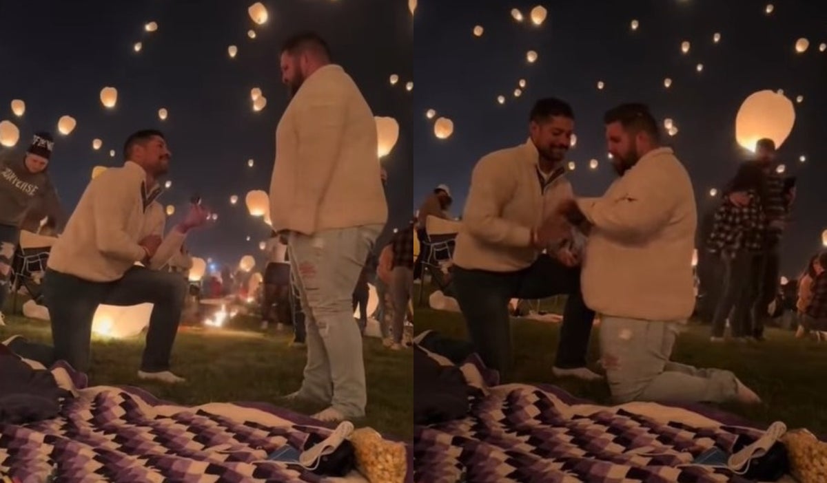 Sin embargo, su novio está tan concentrado viendo los globos que se demora algunos instantes para darse cuenta. Al voltearse, se percata de la sorpresa de su amado, quien en medio de lágrimas le pregunta si quiere casarse con él.