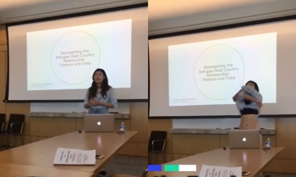 En el marco de la presentación académica que estaba realizando ante los docentes que evaluarían su tesis de grado, Letitia Chai tomo la determinación de desnudarse como respuesta a las palabras de una profesora que días atrás, en medio de un ensayo de para presentación oficial, lanzó críticas en contra de su atuendo.