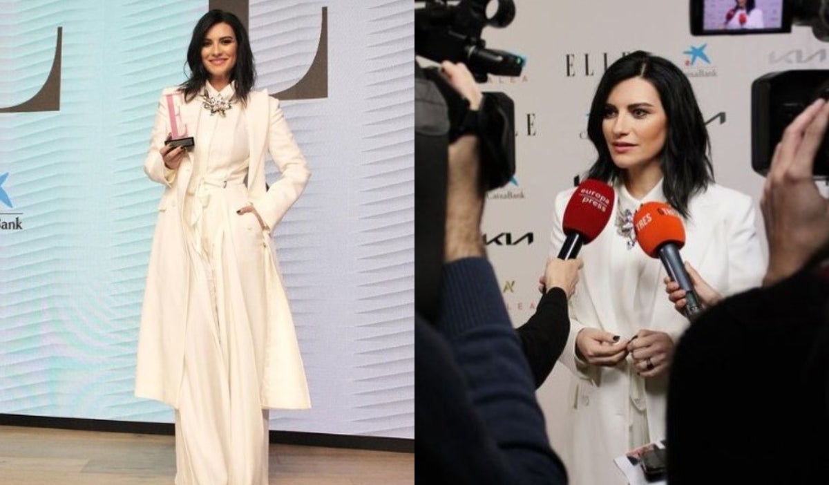 Pausini, deslumbró a todos los asistentes de la ceremonia por lucir un vestido blanco compuesto por una camisa, un pantalón ancho anudado con cinturón de la misma tela y una chaqueta larga, al estilo gabardina.