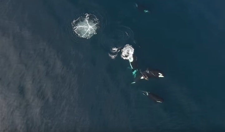En el video, captado con un drone, se puede observar a dos de los cetáceos, de gran tamaño, paseando al escualo entre sus dientes de un lado a otro.
