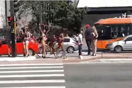 Mientras siete mujeres en bikini hacían publicidad en un semáforo, el conductor de un vehículo se distrajo y terminó estrellando su vehículo contra una baranda de contención ubicada a uno de los costados de la vía.